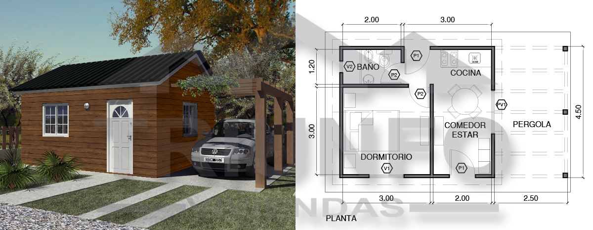 Para aquellas personas, que están interesadas en el negocio del turismo, el mismo combina una bella madera rustica estilo cabaña exterior con una pérgola estilo moderno (Opcional Galeria), para usos múltiples. Las cabañas están equipadas en su interior con paredes de Durlock, y su exterior con medios troncos de pino. Todo el techos son de chapa trapezoidal y en el interior son de machimbre de pino de primera calidad. Las puerta chapa doble inyectadas con poliuretano expandido. Las ventanas son de aluminio pintadas en horno color blando con vidrios repartidos. Las dos cabañas estan distribuidas en una habitación matrimonial, baño, cocina, estar- Comedor y una pérgola lateral (Opcional Galeria) con un total de 31,5 m2.