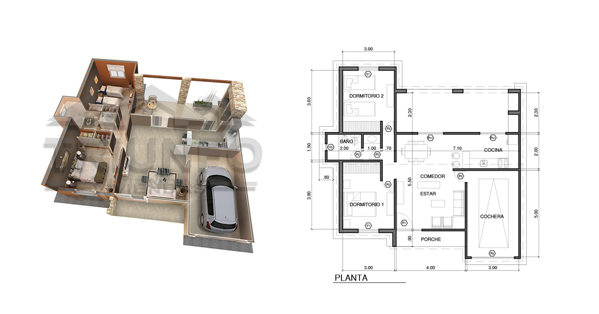 Consta de 2 Dormitorios N°1 de 3.60x3.00 , N°2 de 3.90x3.00 Estar Comedor de 5.50x4.00 ,Cochera de 5.00x3.00 , Cocina de 3.00x2.00 , Baño y Ante Baño de 3.00x1.50 , Galeria de 7.00x2.50 y Porche.
