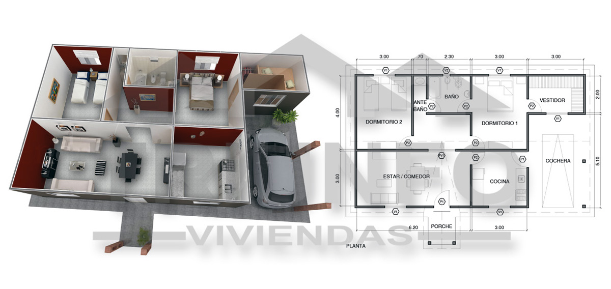Consta de 2 Dormitorios N°1 de 3.00x4.00 , N°2 de 3.00x4.00 N°3 4.00x3.00 Estar Comedor de 6.20x3.00 , Vestidor de 3.00x2.00 , Baño y Ante Baño de 3.00x3.00 , Cocina de 3.00x3.00 Galeria- Cochera de 5.10x3.00 y Porche.