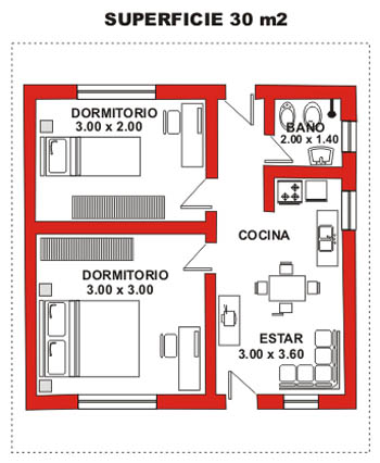 Casa de 2 Dormitorios 1 de 3.00x3.00 Uno de 3.00x2.00 Cocina Estar 3.60x3.00, Baño de 2.00x1.40, toda revestida con fibrocemento por fuera y Durlock por dentro, aislacion interna de paredes, y aislante especial de techo, con ventanas de aluminio laqueadas blancas, puertas placas internas, puertas de frente de doble chapa inyectada y de galería, chapa de techo aluminizada calibre 25 (antigranizo) trapezoidal o sinusoidal.